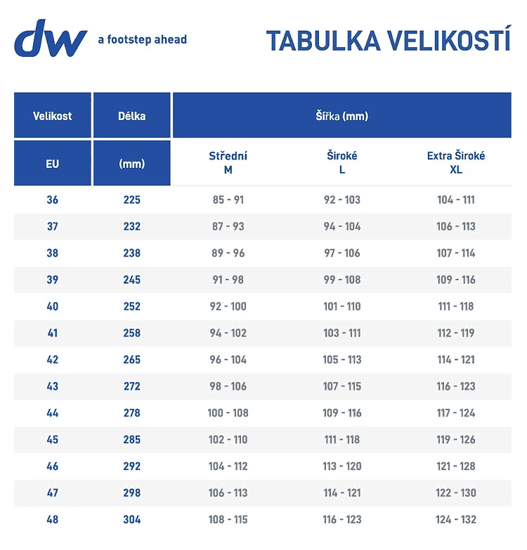 Boty jsou dostupné ve 3 šířkách, aby dobře seděly různým tvarům chodidla. Podle šířky: Médium, Široký (large), Extra široký (extra large).