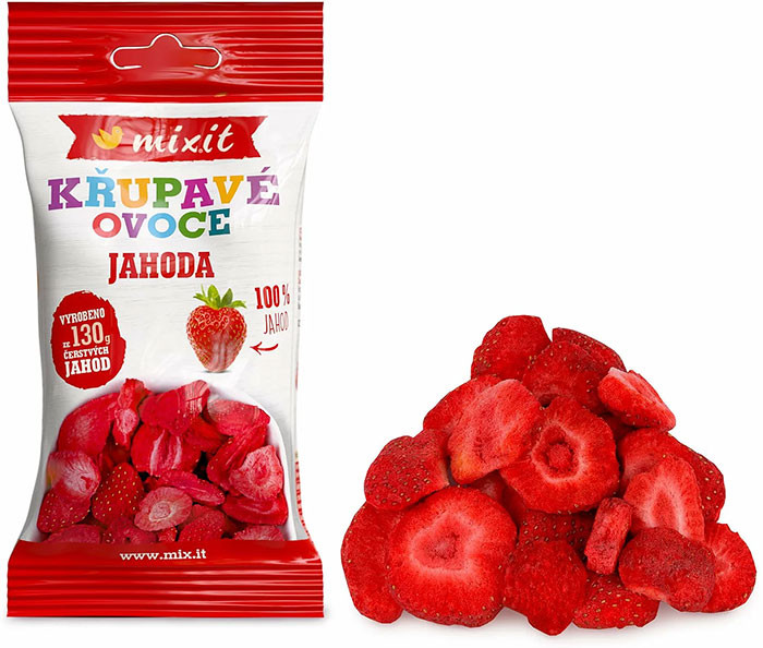 Zaujímavosť: Na výrobu 13 g mrazom sušených jahôd v tomto balení bolo použitých zhruba 130 g čerstvých plodov. - Materiály