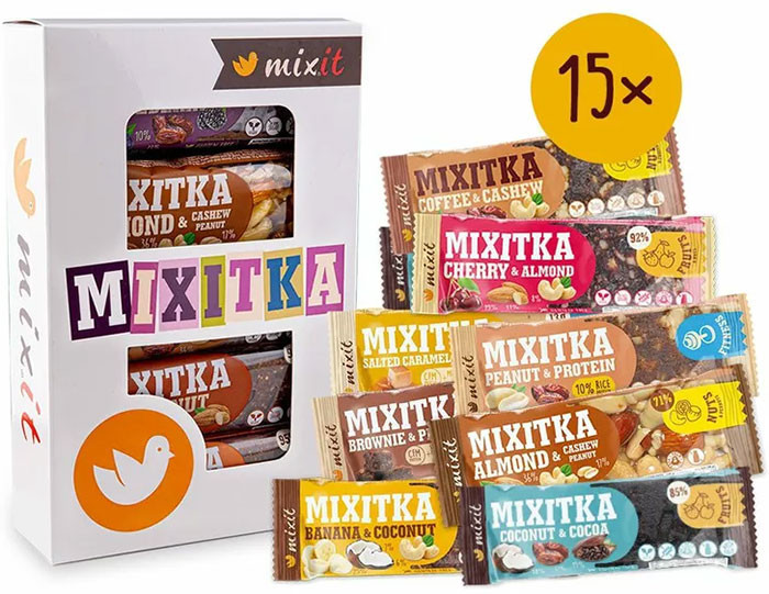 15 Mixitiek v krásnej darčekovej krabičke. Či už urobíte radosť sebe alebo obdarovanému, v krabičke čaká naozaj bohaté degustačné menu s Mixitkovými bestsellermi ako sú slaný karamel, kokos a kakaové bôby, povzbudivá káva, osviežujúca čerešňa alebo banán a kokos, brownie a tiež arašidy s proteínom. A nechýba ani Oriešková Mixitka s mandľami, kešu a arašidmi. - Materiály