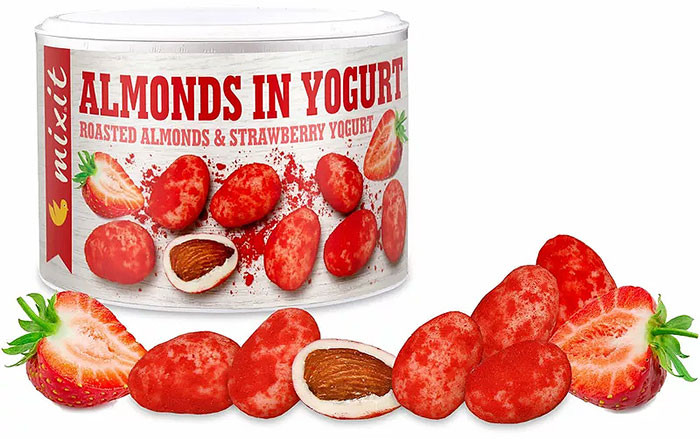 Zloženie: pražené mandle v bielej čokoláde s jogurtovou príchuťou s jahodovým práškom (biela čokoláda s jogurtovou príchuťou 71 % (cukor, kakaové maslo, sušené mlieko, sušený jogurt 2,5 % (mlieko, jogurtová kultúra), regulátor kyslosti: kyselina citrónová; emulgátor: lecitíny; vanilkový extrakt, prírodná jogurtová aróma), jadrá mandlí pražené 24 %, prášok z mrazom sušených jahôd 5 %)