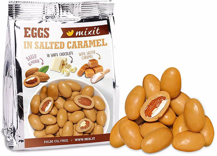 Sladké priania so štipkou soli boli vypočuté a Mixit vajíčka sú už aj v balení do vačku! Chrumkavé pražené mandličky v bielej čokoláde doslova vykúpané v slanom karameli sú to pravé orechové. Zobkačka na desiatu či na cesty, o ktorú sa nebudete chcieť deliť. Dokonca aj so zavretými očami spoznáte, že sú to tie pravé Mixit vajíčka - ako vždy bez palmového oleja. - Materiály