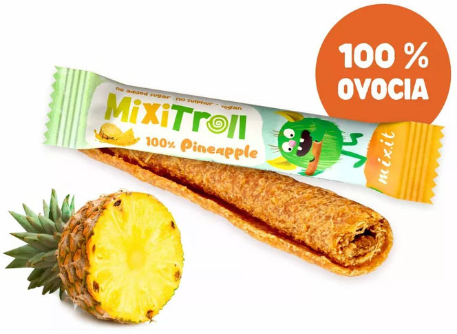 Nechceme vás vytroliť, táto dobrota zo 100 % ovocia je sladká pravda! Kto povedal, že ovocie nemôže byť zábava? Ochutnajte obľúbený ananás v novej podobe! MixiTroll - Ananás je lahodná a zdravá rolka vyrobená zo 100 % čerstvého ananásu bez pridaného cukru, farbív a konzervantov. Sladká chuť exotiky, ktorá sa zmestí do vrecka – ideálna ako zdravá desiata na cesty, do práce alebo pre deti do školy. Každá MixiTroll bola vyrobená metódou šetrného sušenia pri nízkej teplote, takže si zachovala všetky prospešné vitamíny a minerály.